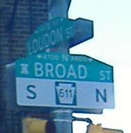 A fourth, and atypical, style of Philadelphia shield appears on Vine St. EB, carrying traffic from I-676 EB, and then a more traditional shield appears on the far side of the intersection. But wait, why is it signed for WEST? It's because there's no left turn from PA 611 NB onto Vine St. WB (north side frontage road), so traffic must turn right and loop over the freeway at the next cross street.