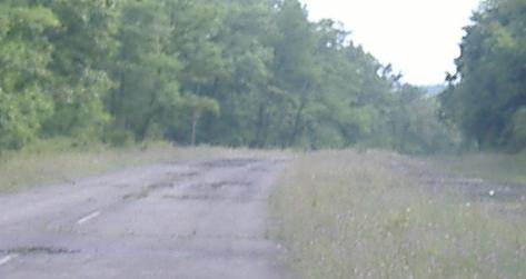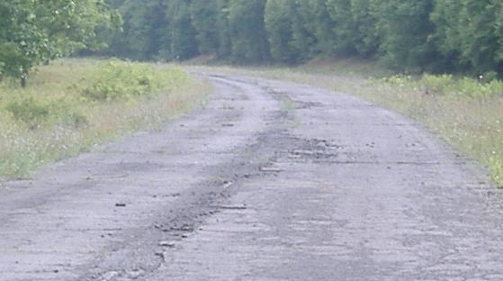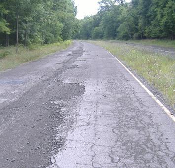 As you saw in the last photo of the previous run and as you see in the second photo of this one, all of a sudden the westbound lanes, which I had been following so faithfully for the first 55 photos, have become the worse ones, and so I switch to the eastbound lanes, which have recovered sufficiently from their state of disrepair further west that they now have old lane stripes themselves.