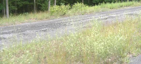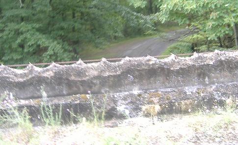 The Oregon Road underpass looks quite a bit worse than the Mountain Chapel Road underpass from the first eastbound page. As you can see from the westbound (first photo) and eastbound (second photo) railings, the concrete has been chipped off, possibly from accidents or just maybe from general age, and the rebar (reinforcement steel bar grid around which concrete is poured; the steel gives concrete tensile strength) shows through. Oregon Road is seen looking south in the third photo.