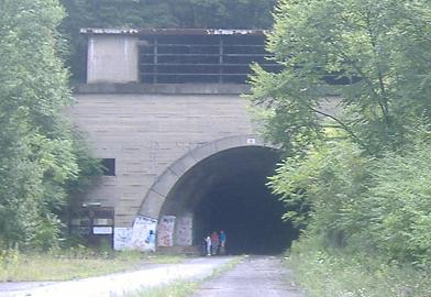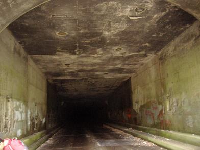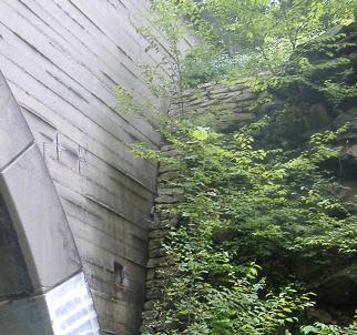 As I approached the entrance to the Sideling Hill Tunnel, I found another group of interested tourists. I dutifully snapped my shots of exposed reinforcement steel along the tunnel face (most likely from water dripping down and eroding the concrete), and then the manmade stone walls on the westbound and eastbound sides, respectively. Note how the eastbound side's wall segues into a natural rock face.