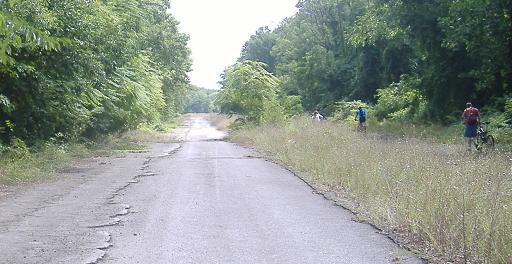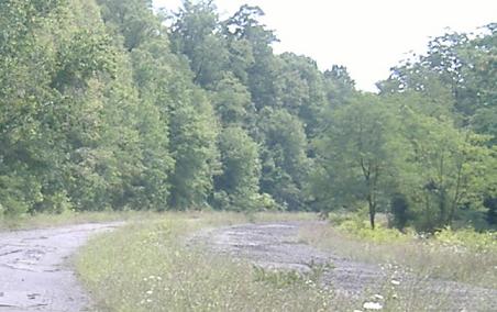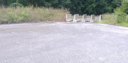 Just after the rest area, here's the parking area at the other end of the trail, surrounded by more Jersey barriers to keep motorized traffic off the ex-freeway. On the other side of the grass mound is a drop to Pumping Station Road, which used to have an overpass that was removed to prevent continuity of the bike trail with Turnpike property (property that leads back to the Turnpike itself, and is long enough at 1-2 miles to still allow striping tests).