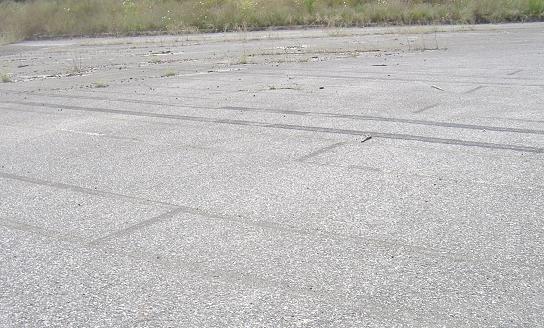 Into the rest area, looking east (the wrong way) and west at the original truck parking stripes. You can see traces of even earlier stripes among them.