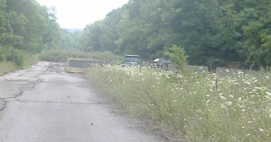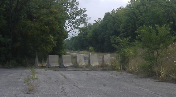 Looking west toward the westbound on-ramp, curiously barricaded (just like the other end, as you'll soon see). Both ends of the Turnpike are gated, so there's no reason at all to do this. All I can think of is that this area was closed before the rest of the Turnpike, and the Turnpike Commission left the barriers there when traffic went away. I have to say though, those barriers are in awful good shape if they've been left there thirty years.