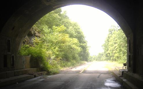 A ghostly centerline photo, then out to the other side of the tunnel, where you can sort of see what's going on outside. I'll leave that for the second page, and leave you here with a mysterious manhole. I was not willing to climb down there on my own and explore in the depths of decaying leaves and other muck.