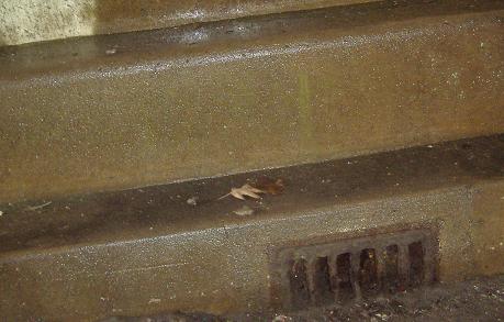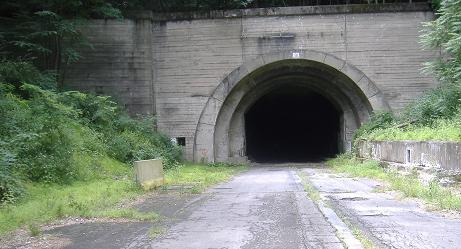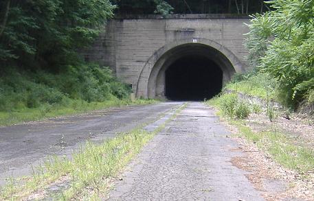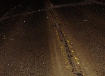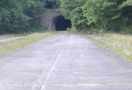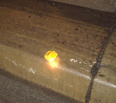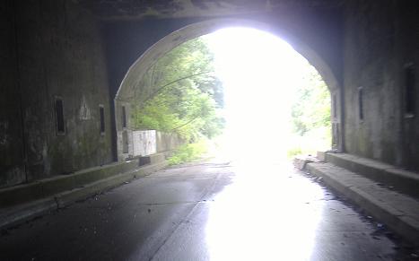 The center stripe, some side drainage, and one of the only reflectors to be found anywhere on the abandoned Turnpike (even including those installed further down this page in the striping test). You can see that the tunnel is not just dark, it's perennially damp from being an unlit, unventilated cave. Start the fan up!