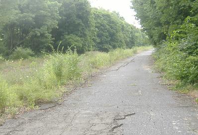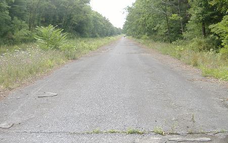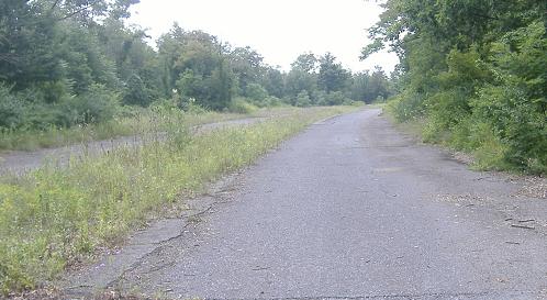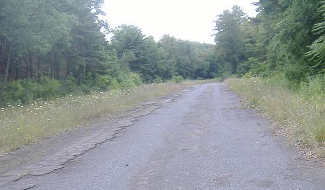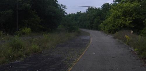Past the overpass with its single warning stripe (if it ever had a warning diamond or other yellow sign, it's been gone for many years), onto the striping test section with a well-formed rumble strip and helpful warning grooves along the lane line. Two things to note are that these lanes are approximately half-width (now being perfect for two-way bike traffic), and that the pavement is old enough to still crack along the lines of the original concrete pavement underlying the entire abandoned Turnpike, despite its smooth surface. (Obviously, the westbound lane was paved after traffic was no longer driving on this part of the Turnpike, so there has been nothing but time to wear it down, and time has, well, all the time it wants.)