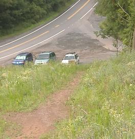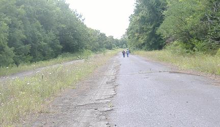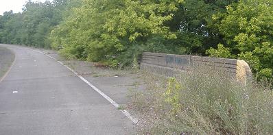 Over the gravel mound, the pavement has been removed, as has the US 30 overpass. A dirt trail takes you to the edge of the former eastern abutment of the overpass, and then heads straight down to the crook of Tannery Road, where other explorers have parked for the day but I have not. Next time, I would, but the next time is probably when the Pike2Bike trail is refurbished, so watch this space in 2012!