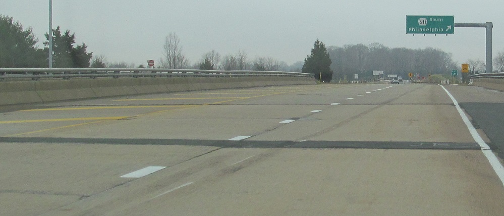 The would-be PA 611 NB loop ramp to US 202 SB comes in from the right, but there's barely any freeway to merge into. The other end of this ramp is blocked by debris, so it's paved for nothing.