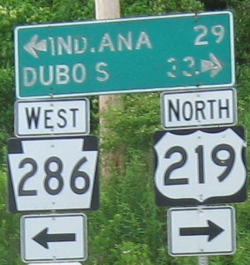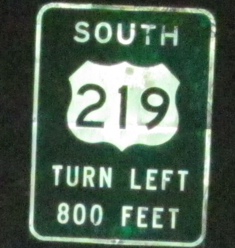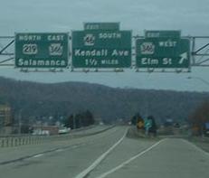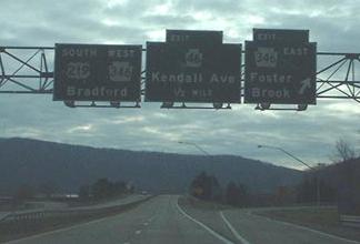 Owens Way EB at the southern end of the Bradford bypass, also courtesy Doug Kerr. US 219 has two different freeway sections, and if they ever gets connected and receive an Interstate designation like US 220 did to the east, you could see I-79/I-67/I-99/I-81 as the eastward progression.