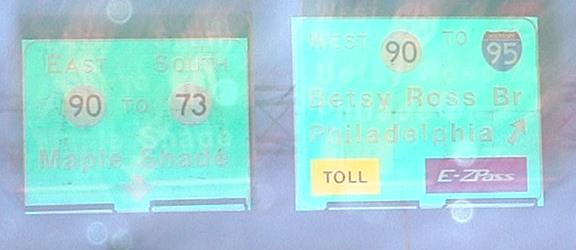 WB on the short US 322 expressway, between the Commodore Barry Bridge to NJ and I-95. The signage has the wrong background green, terribly non-reflective lettering, and not quite the right font. It's DRPA [Delaware River Port Authority], like one associated with NJ 90.