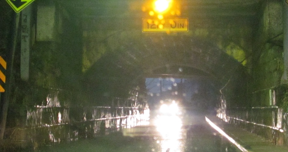 US 322 WB nearing Downingtown, simultaneously under a railroad viaduct and over East Branch Brandywine Creek.