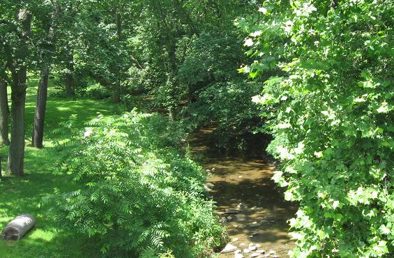 Looking north along the tiny creek. Despite its size, the creek was enough to warrant being crossed by a bridge instead of being thrown into a culvert. Thanks to 19th century bridge technology, it had to be crossed at a 90 degree angle, and that's how the bridge got its "S" shape.