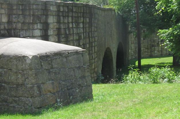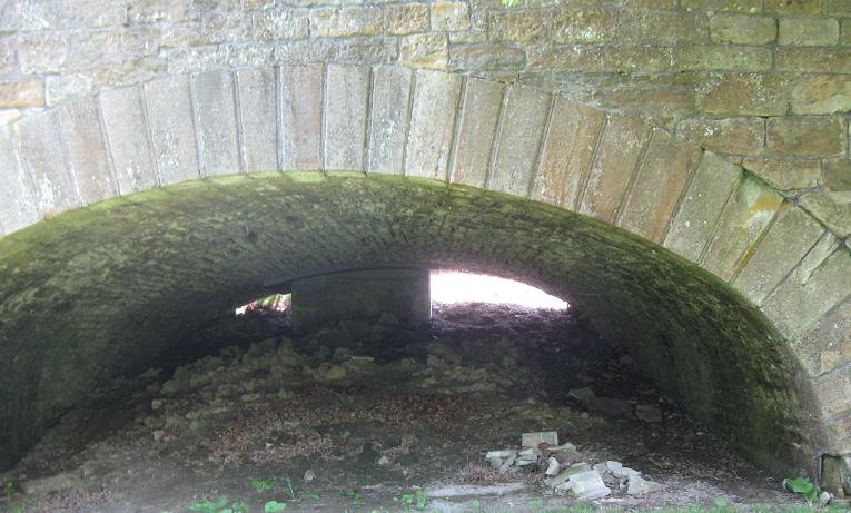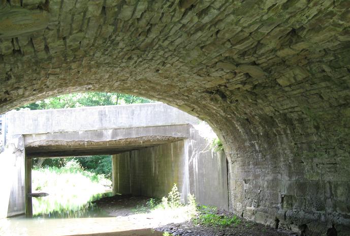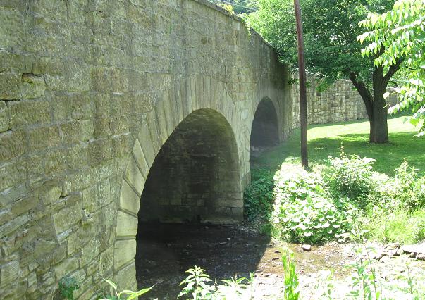 Walking along the north side of the bridge, built with two arches even though the brook only uses one.