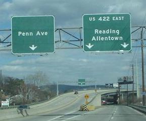 The first one is EB at the US 222 freeway, which US 422 is about to join, and the second one is WB on 422/222 (which is why 422 is about to exit), both near Reading and courtesy Doug Kerr. To the west and east of Reading (i.e. not on the freeway segments), US 422 and Penn Ave. are the same road.
