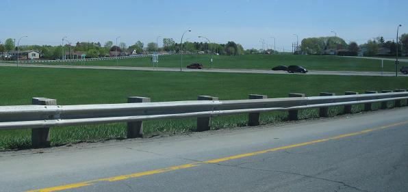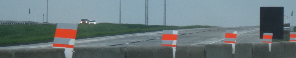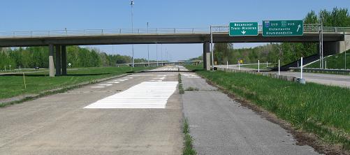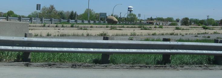 The same location in summer, looking east from A-55 NB. The 100 inch-wide lanes continue practically into the merge with the active frontage road, which then swerves over to the WB side and the Super-2 freeway (i.e. the EB side would be added when it's twinned, if it ever is).