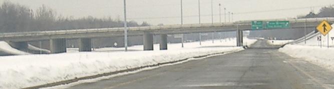 The snow-covered stub west of QC 132, and looking east at the four-span QC 132 overpass with nothing in the middle. Satellite photos are inconclusive, but it appears the inner lanes are indeed paved, just not plowed for obvious reasons.