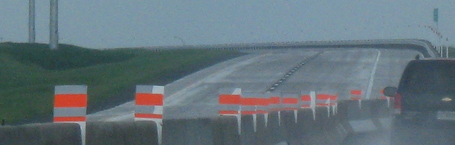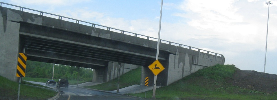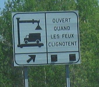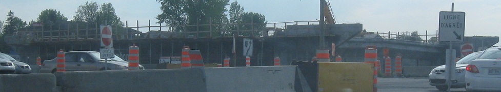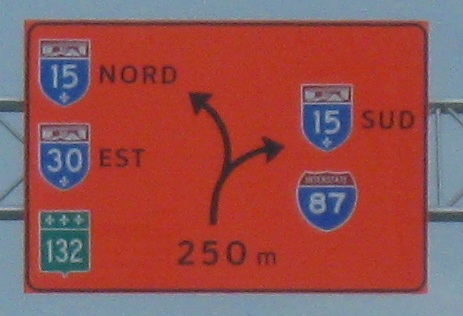 Fun signs EB on the Châteauguay bypass. The first sign only looks like it says the future is in A-30, seemingly more propaganda to convince people they really want this freeway (and most really do, but plenty of vocal ones don't), but it really just means "the future is coming" - "en route" as opposed to "Route 30" is how it should be read. (Well, maybe. It's craftily done.) The second sign is the happy arrow with the disconnected hands who gives you nightmares and tells you to be careful, be responsible, and slow down. I have named him Frédéric Laflèche (Fred Arrow). He is the freakiest mascot anyone could wish for, and uniquely Québecois.