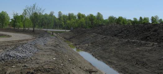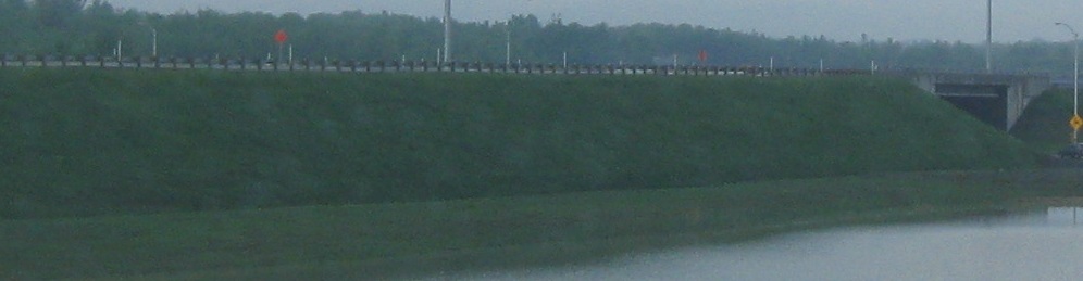The eastern end of the main section of A-30 freeway in Sorel, with two paved carriageways continuing a short distance beyond the barricades before ending on the embankment shy of QC 133. One day they will continue as an overpass.