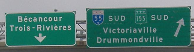 On the frontage roads at the A-55 interchange, just after entering the easternmost segment of A-30 from QC 132. The freeway hasn't been built through here yet, so A-30 follows the frontage roads for 1-2 km until it's clear of A-55. These signs surprised me by being somewhat old, given how new and piecemeal A-30 is in general. Also, QC 155 was decommissioned south of the St. Lawrence River in 2006 once A-55 was completed up to here, so the signs should have been covered. (They're still out there - THESE old signs - 15 years after I first saw them!)