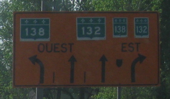 WB on the bypass at its pre-2012 end, Blvd. St-Jean Baptiste. In case you need help interpreting the poorly assembled sign, QC 138 is the crossroad, QC 132 WB continues straight, and QC 132 EB is to the right. The overpass will carry QC 138 over the future A-30 interchange, and QC 132 will become a frontage road pair for a short distance to the west. Photos continue on my QC 132 page, linked at bottom.