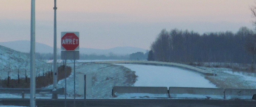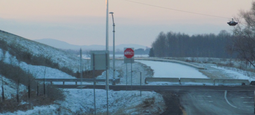 Fast-forward to late 2014 and drive the new A-35 south (opened in October) with me, as far as it extends as of this caption (2021) to QC 133 at Sortie 15. The stub ahead ends just after the intersection, but it is just two committed contracts away from completion to the border.