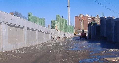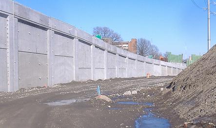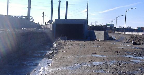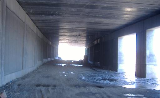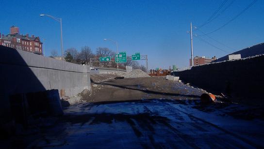 Just as a further tease, photos walking down off the bridge, back toward the twisting ramps again. In these photos, the onramp tunnel is to the right, and the Exit 3 offramp would fly over it from this height. The roof of the tunnel is getting built up with enough rebar to handle offramp traffic.