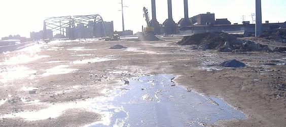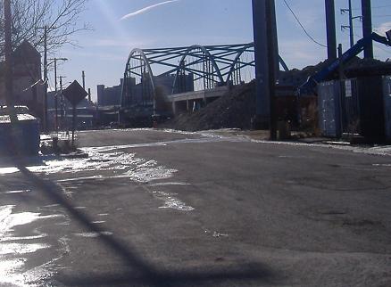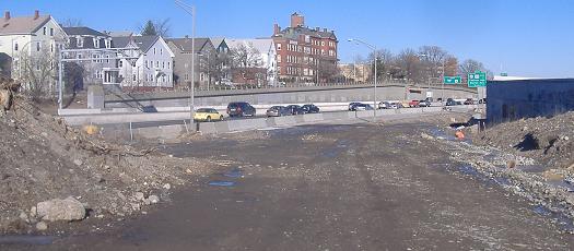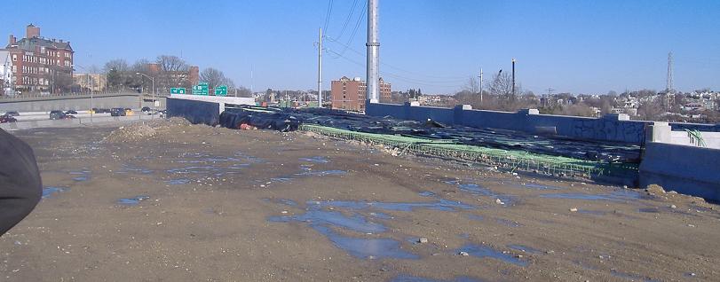 Out the beginning of the onramp, standing in India St. and looking west at the new bridge.