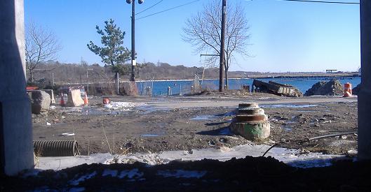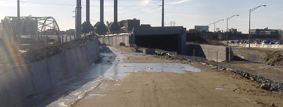 Through the piers on the right side of the onramp tunnel, looking at the mouth of the Seekonk River.