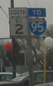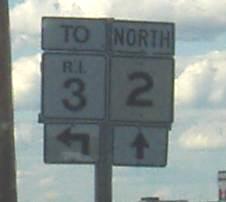Just like in the photo atop this page (taken just south of here), the new, wrong font appears. The TO is also wrong. RI 3 used to continue straight on a duplex with 2; RI 2 followed what's now RI 10 and 3 ended at US 1 where RI 2 now ends.