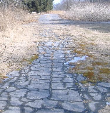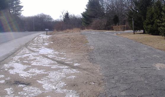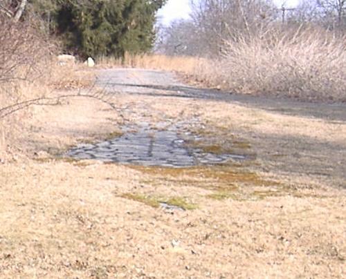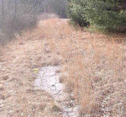 Turned around south again, and walking back toward the forest. As you can see, the northern section is used in two pieces and abandoned between them, but the pavement is continuous.