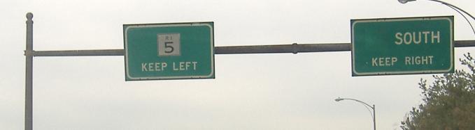 A pair of ancient signs on RI 2 SB at its junction with RI 5. This is a left exit because New London Ave., which had been 2 to this point, continues straight on down to 5. In fact, after RI 5, RI 2 quickly has a junction with RI 33, which picks up the course of New London Ave. This is the same old turnpike that continues in fits and starts (many pieces have gone back to forest), becoming RI 3 and CT 184 on its way to, gee, New London.