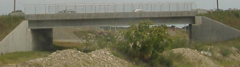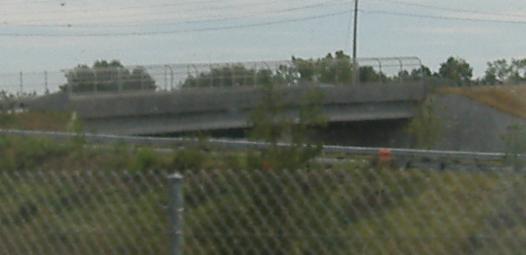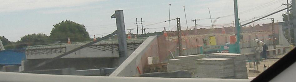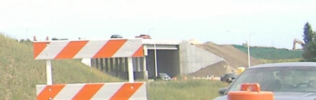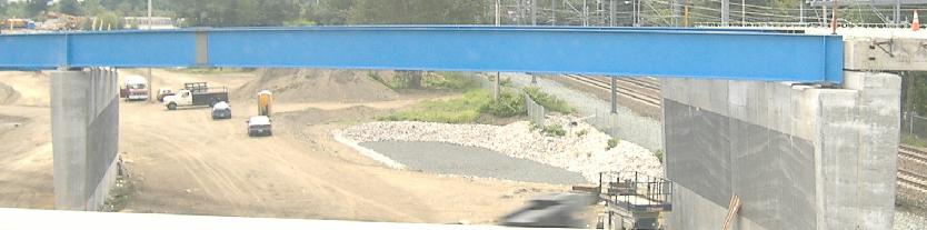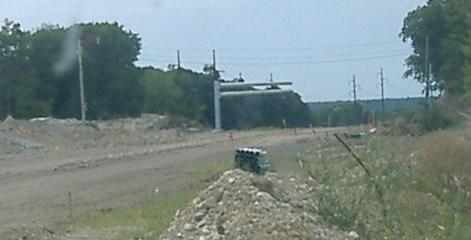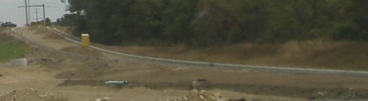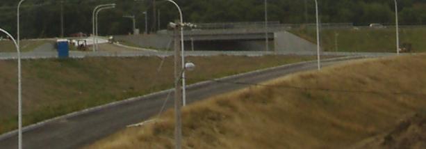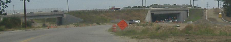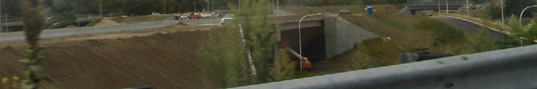 The bright blue four-lane railroad overpass in the vicinity of Old Baptist Road, and the current northern end of freeway construction.