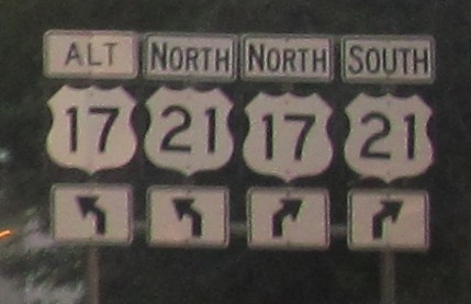 US 17 SB/21 NB (let's call it westbound) and then at the eastern end of the wrong-way US 17/21 multiplex, with shields that would make NJDOT weep for joy.