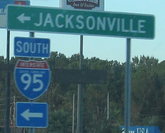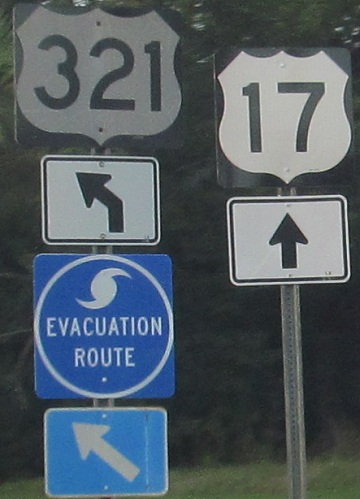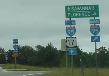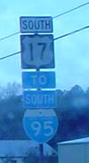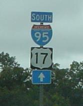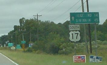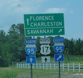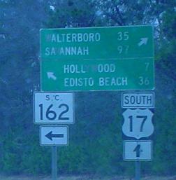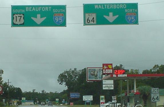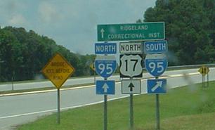 SB heading south from Charleston, passing an old sign whose arrows are clearly behind the times, judging by the newer shields, and coming to another black-background 17 shield on a crowded overhead in Jacksonboro.