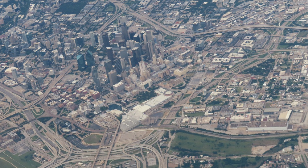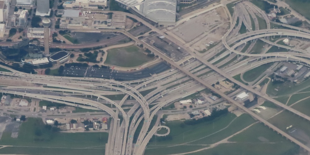 Let's start off in Dallas, where I-30 once began. It actually began east of downtown, with I-20 coming in on what is now just US 80 and taking over the entirety of what's now I-30 from there west as the (originally tolled) Dallas-Fort Worth Turnpike. But I was flying to the west, so from there we see the Dallas skyline rising in the middle of an inner loop of freeways. Let's start with the subject highway, I-30, which comes from the bottom left of my photo and heads east out the top right. Along the way there's a surprising 4-level stack interchange with a surface street, Cesar Chavez Blvd. - it becomes TX 310 to the south and carried US 75 to Galveston before I-45 came into existence. Those ramps come down in the median of I-30 to the east so as not to interfere with the 4-level I-45 stack just beyond. I-45 comes in from the right, ends at I-30, and becomes the hidden I-345 (only signed as US 75 for some reason) across the top of the image, the east side of the loop. I-345 ends at the complex 3-Y at top left, with US 75 continuing north (off the page) and TX Spur 366 coming back onto the north side of the loop. That interchanges with I-35E at the bottom left of this photo, which completes the west side of the loop back to I-30.
