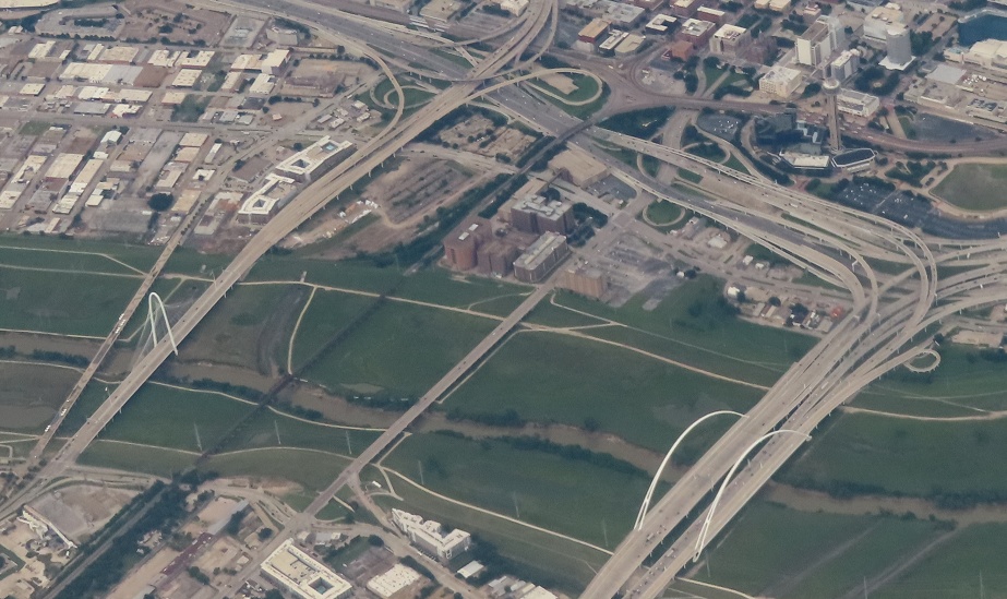 Looking a bit closer at how I-30 and I-35E run together without being a multiplex. I-30 comes in the bottom and runs the median, I-35E crosses from left to right and straddles I-30, and just enjoy all those ramps connecting them as they run together under the Houston St. and Jefferson Blvd. Viaducts coming off the Trinity River (just below this photo).