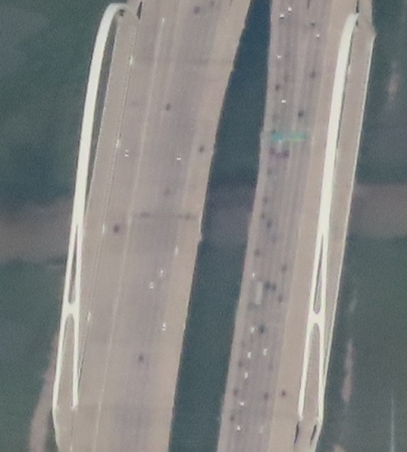 Speaking of just below that photo, here are the Trinity River crossings west of downtown Dallas. I-30 is the one on the right through the arches of the Margaret McDermott Bridge. Skipping the boring Commerce St. bridge in the middle, the complementary bridge on the left happens to also be a Margaret: the Margaret Hunt Hill Bridge on TX Spur 366. The arch is lateral instead of longitudinal and that lends it the common name "Hoop Bridge". As before, I-35E links them all at top, on the east side of the river.