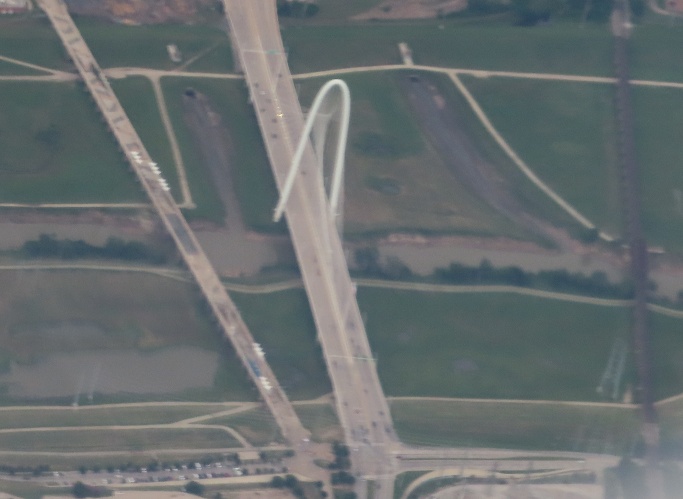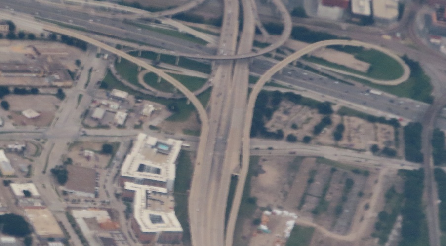 You're seeing most of TX Spur 366 here, a short highway that begins on the west side of the Trinity River (bottom of first photo) and crosses it on the Margaret Hunt Hill Bridge between a pedestrian bridge (the colors are artwork) and a railroad bridge (there is a truss that didn't come out from my altitude). Continuing east, there's the interchange with I-35E you see in the second photo. You may also see a pair of stub ramps, the EB entrance being more visible but both lengthening the I-35 ramp connections to make everything fit vertically. They were never built out, but I'm thinking they were intended for the area below the interchange that was once railyards but may now be getting redeveloped. Someday those may be ramps to the empty lots at bottom right.