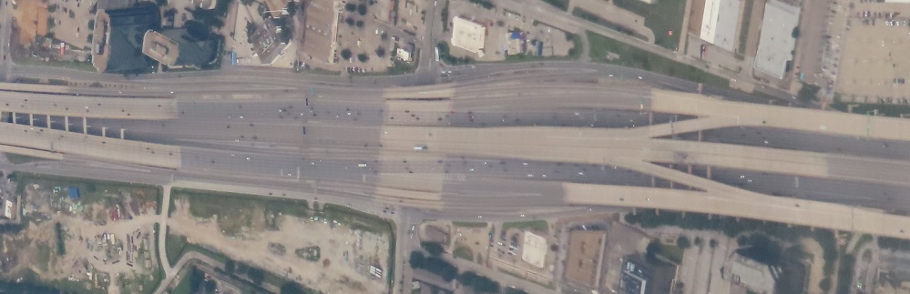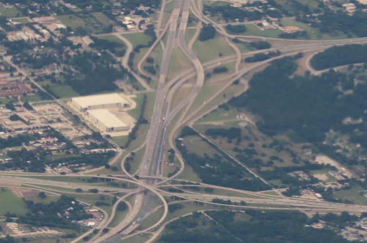 Aerial view facing south, I-635 gets complicated as it heads east from I-35E (off the screen to the right). The Exit 27 ramps from that massive interchange are coming down from the top of the stack to the level of the express toll lanes in the median. As they interface, the rest of Exit 27 drops down to meet the I-635 mainline, which happily rises up to meet it. At the same time, curiously, the inner lanes are also interfacing with the middle of I-635 and end up dropping down below the mainline, resulting in the structure you see on the left - everyone has flipped position! Oh, and there are still more local ramps outside of all that. That's Texas for you.