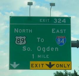 Up north of Salt Lake City in Ogden, the salt air must be getting to people's heads. The shields should be right under their directions, not justified to the sides, and then the "TO" should be clearly between the two routes - US 89 TO I-84, not both of them to South Ogden. I-84 doesn't come by until Exit 340, and U-26 (Exit 339) can complete the missing move up there, but using US 89 lets you cut across the east side of Hill Air Force Base, at the expense of traffic lights and lower speeds.