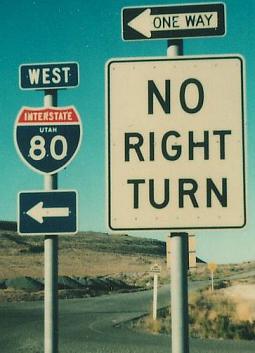 LC- Opposite direction, every sign is wrong but all the scenery is so right. The I-80 comes closest - the arrows should just be one over each lane. The middle sign needs to be wide enough to put its two destinations on two sides so that it doesn't run together as a single, schizophrenic ski area. IF the sign on the right looked anything close to the sign on the left, I could start to accept it.