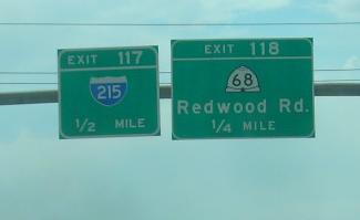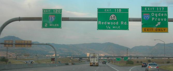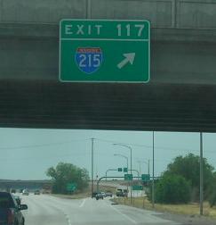DK- Eastbound in the same area. Jct. I-215 makes a terrible destination, and centering the destinations while right-justifying the distances makes a terrible sign. More narrow or old shields are followed by signs that are definitely new, where the font is trying its best to outgrow the sign.