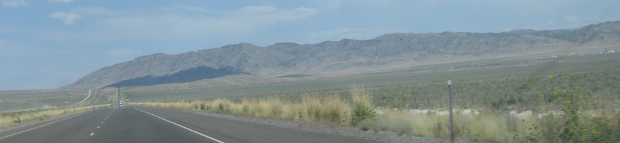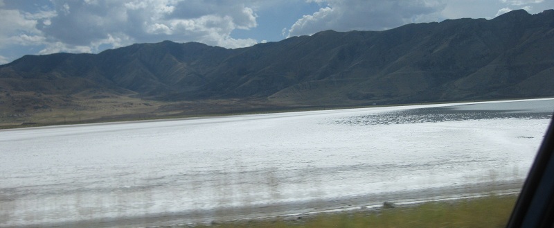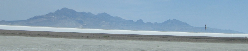 DK- Westbound across the Bonneville Salt Flats, which as you can see are flat and salty. When it rains, people bring their cucumbers here. Not.