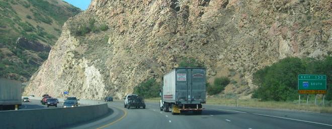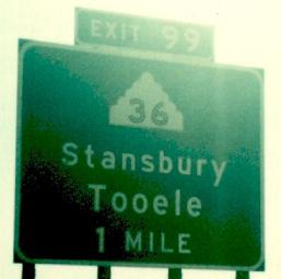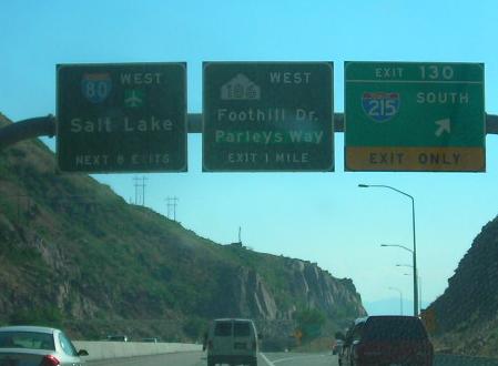 MS- Ignore the foreground for a moment, please. This photo is a double exposure. The flash didn't go off when it was taken on I-80, but of the three BGS's, the one on the right is Exit 129, UT 186. The center one is for what is now Exit 126, 13th (now 1300) East, Sugar House (now Sugarhouse). This was UT 181, but isn't anymore. The left BGS is a pull-through for I-80 WEST, Salt Lake, Reno.