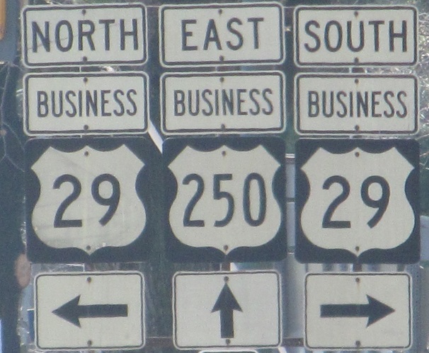 Market St. WB, which VDOT's shapefiles say is US 250, with Business US 250 following High St. There is no sign on Market St. EB where it splits with High St., nor any other signs on either of these streets, so... close enough.