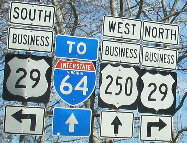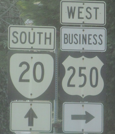 Whichever street it follows, Bus. US 250 ends up following VA 20 on the east side of town. The first sign is at High St., and there's one other sign at the other end of High St. telling traffic to turn right onto Market St., so we'll call that the WB route.