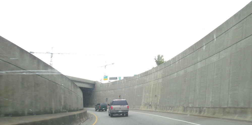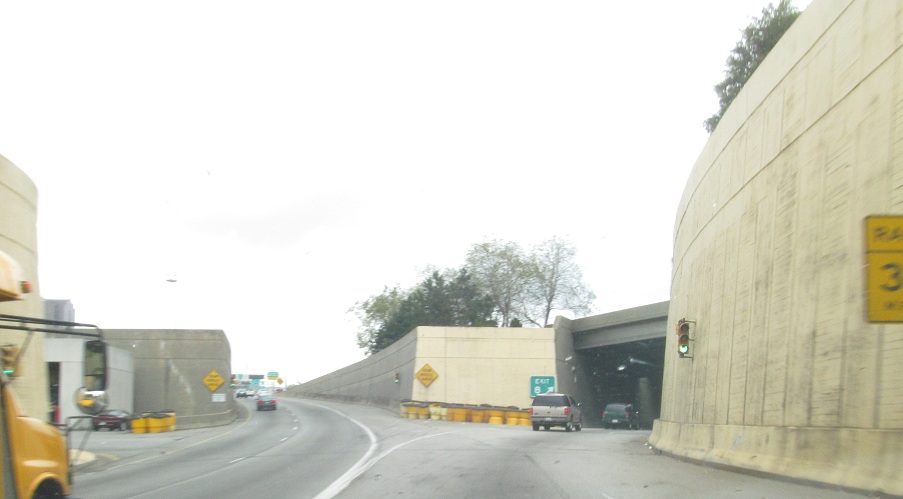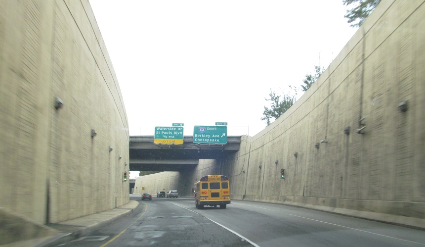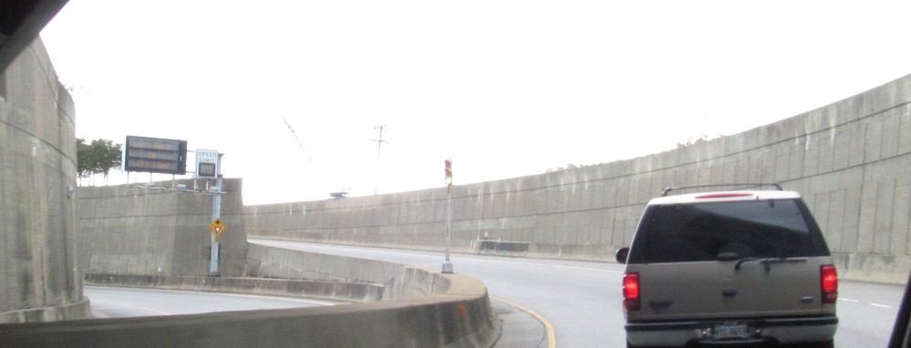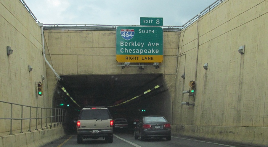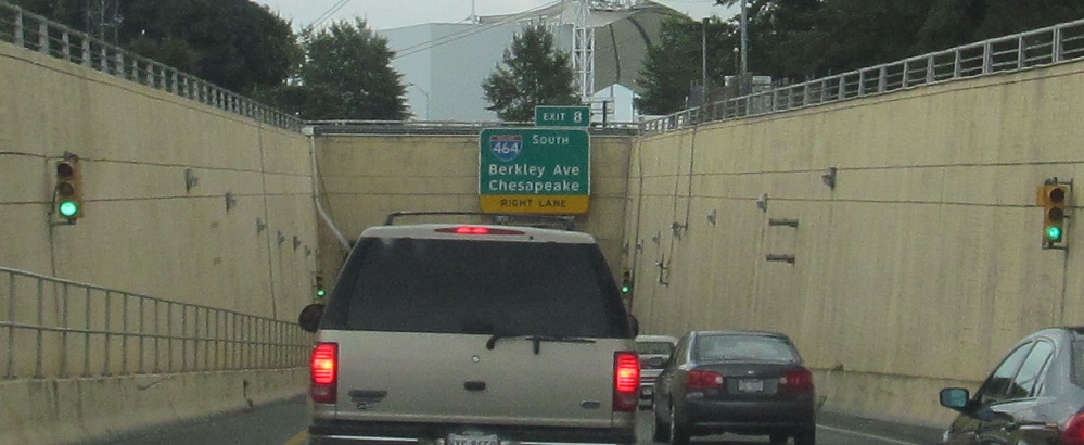 EB through the Downtown Tunnel, a critical link between Portsmouth and Norfolk under the Elizabeth River. It's down deep enough that it's still in a cut section through the I-464 interchange. That's the steepest curve I've ever seen in a tunnel, halfway through.