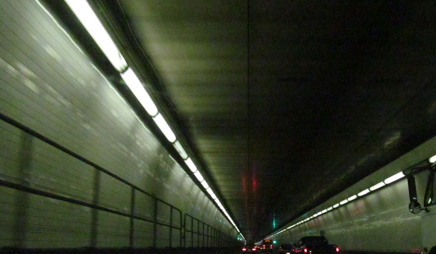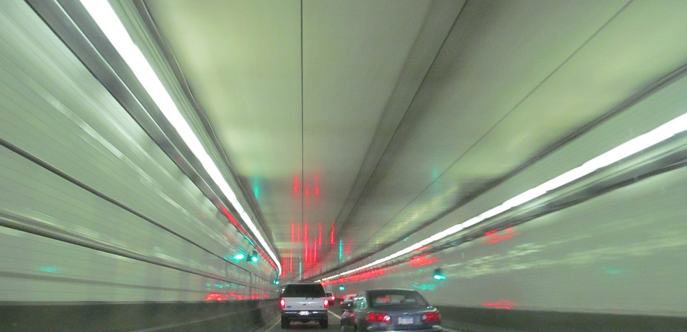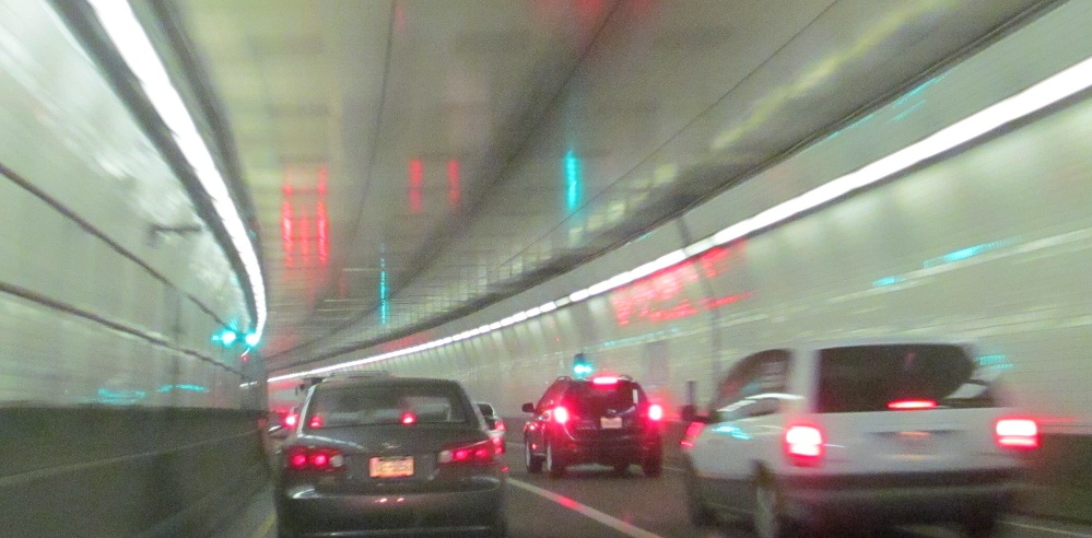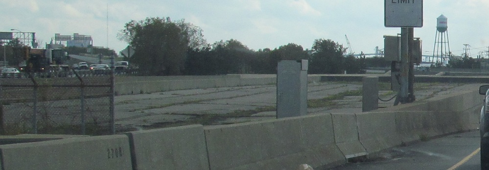 In the midst of traffic heading WB into the tunnel, I had the time to photograph some narrow shields and a large expanse of pavement in the median. This turns out to have been the original area of the toll plaza, back when the south tube was the only crossing here. As much traffic as there is now, it's hard to imagine taking away half of its throughput.
