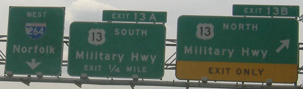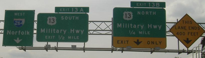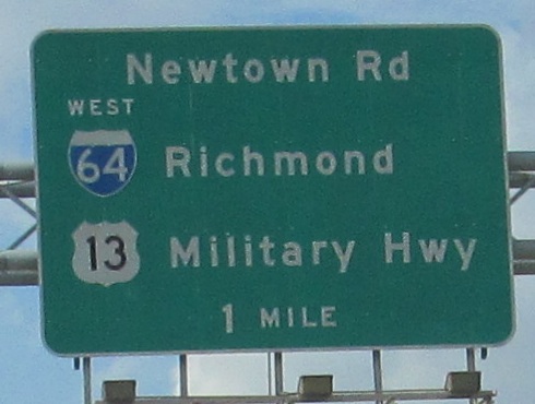 Older WB signs courtesy Lou Corsaro, over the wide C-D road that stretches from Exit 15 (Newtown Rd./VA 403) through I-64 (Exit 14) and past here at lucky US 13/Exit 13.