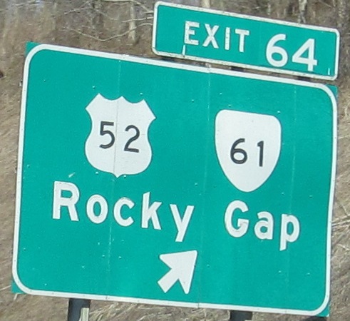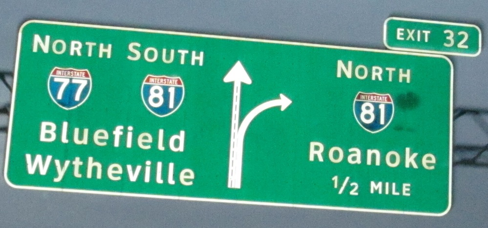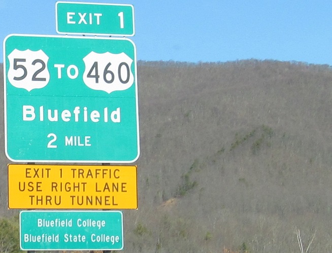 The land between the two tunnels is ripe with old signs. Every exit leads to US 52, which I-77 closely follows through here, including the last one. It's probably not signed there because US 52 NB enters I-77 at Exit 66, and traffic to US 52 SB could just use Exit 64 instead. Exit 1 is, of course, in West Virginia, and this sign feels like one state agency was trying to tell the other to make the sign instead of just letting WVDOH post it outside their territory: oversized shields or undersized sign, multiple added banners, and "2 mile"?